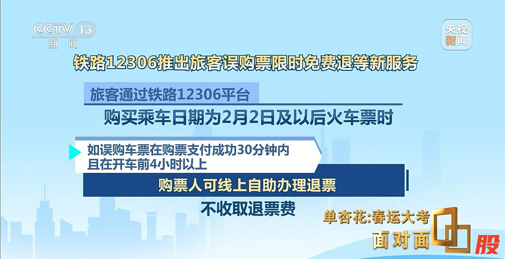 为了进一步提升旅客的购票体验,从1月19日开始,12306平台推出旅客误购限时免费退票的服务,旅客通过铁路12306平台购买乘车日期为2月2日及以后火车票时,如误购车票在购票支付成功30分钟内,且在开车前4小时以上,购票人可线上自助办理退票,不再收取退票费用。